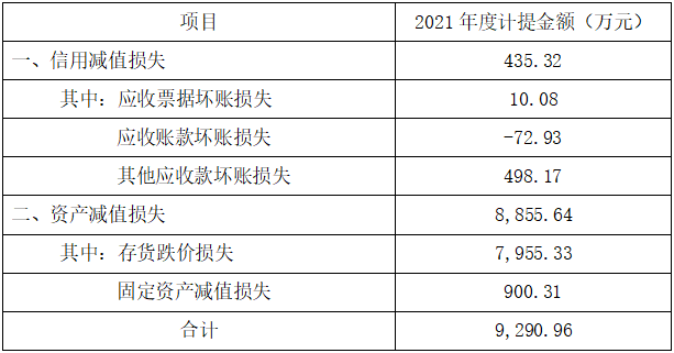 根據(jù)《企業(yè)會計準則》及公司會計政策與會計估計的相關(guān)規(guī)定,為真實、準確地反映公司截至 2021 年 12 月 31 日的財務(wù)狀況及經(jīng)營成果,本著謹慎性原則,公司對截至 2021 年 12 月 31 日公司的資產(chǎn)進行了減值測試,并與年審會計師進行了充分的溝通,對可能發(fā)生資產(chǎn)減值損失的相關(guān)資產(chǎn)計提減值準備。2021年確認的資產(chǎn)減值損失及信用減值損失總額為9,290.96萬元,相應(yīng)減少當年利潤總額9,290.96萬元,具體情況如下表: