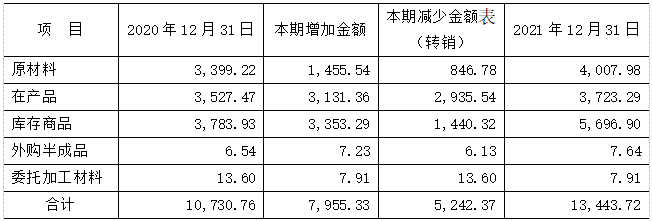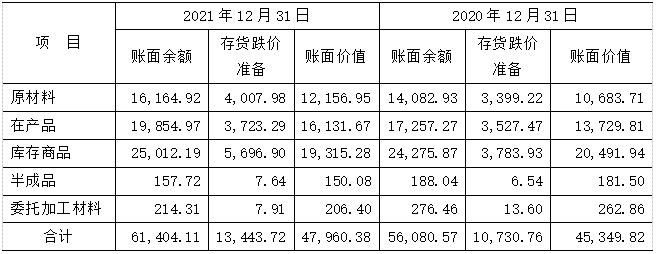 資產(chǎn)負債表日,公司對各項存貨的成本與可變現(xiàn)凈值比較,存貨成本高于其可變現(xiàn)凈值的,計提存貨跌價準備,計入當期損益。2021年公司存貨分類情況如下表(萬元):